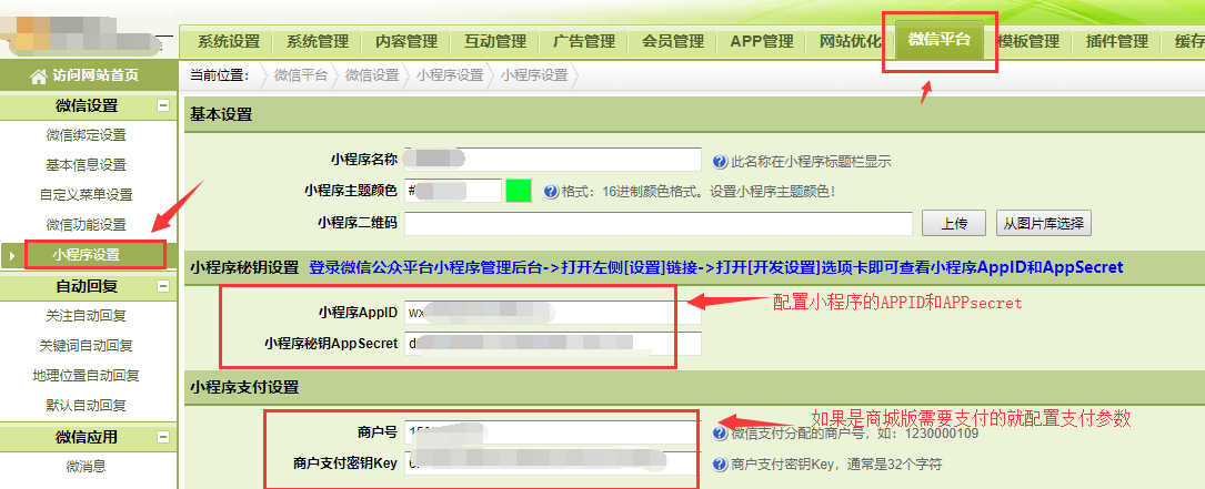 登錄友點網站管理后臺【微信平臺】-【小程序設置】輸入微信小程序的基本參數配置