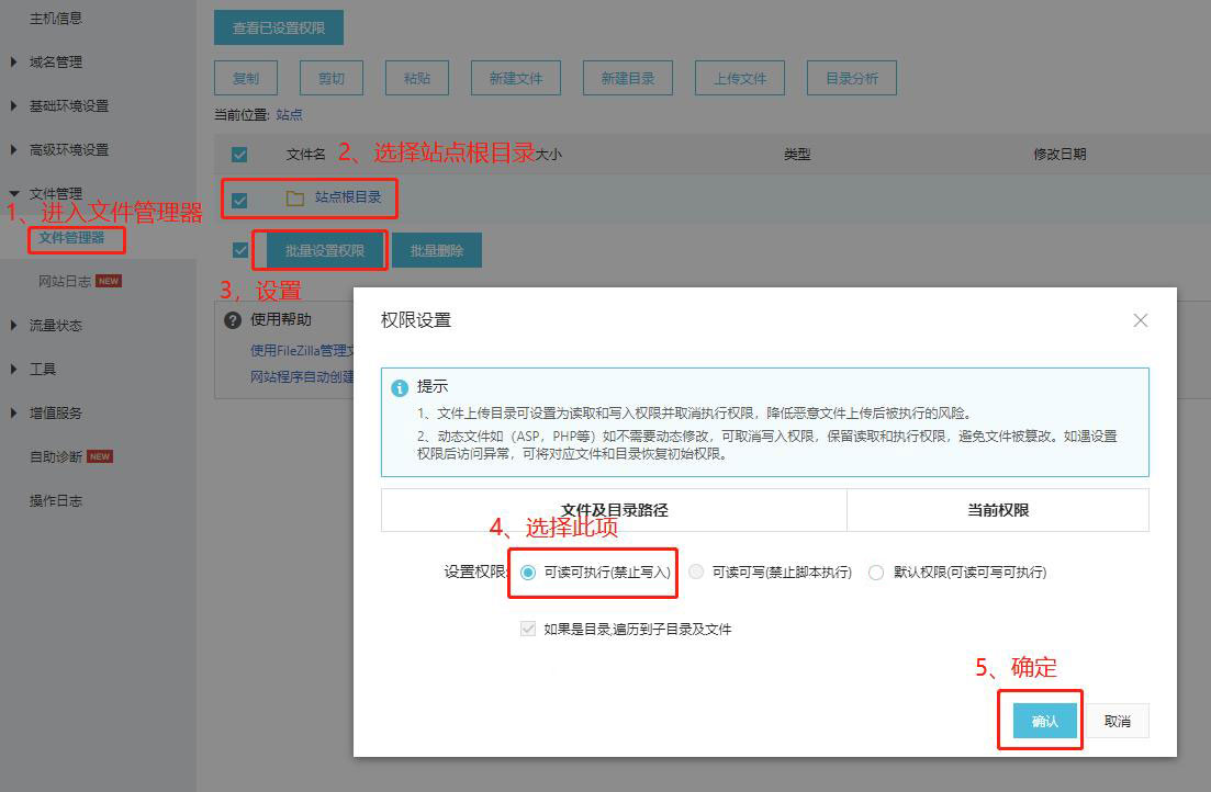注意:不知道大家有沒有注意到,阿里云虛擬主機權限設置固定為3種,存在這樣一種限制:設置目錄為禁止寫入,就無法禁止腳本執行;禁止腳本執行,就必須是可讀可寫。導致存在嚴重的安全隱患(沒有辦法禁止App、Install、Public腳本執行權限)。