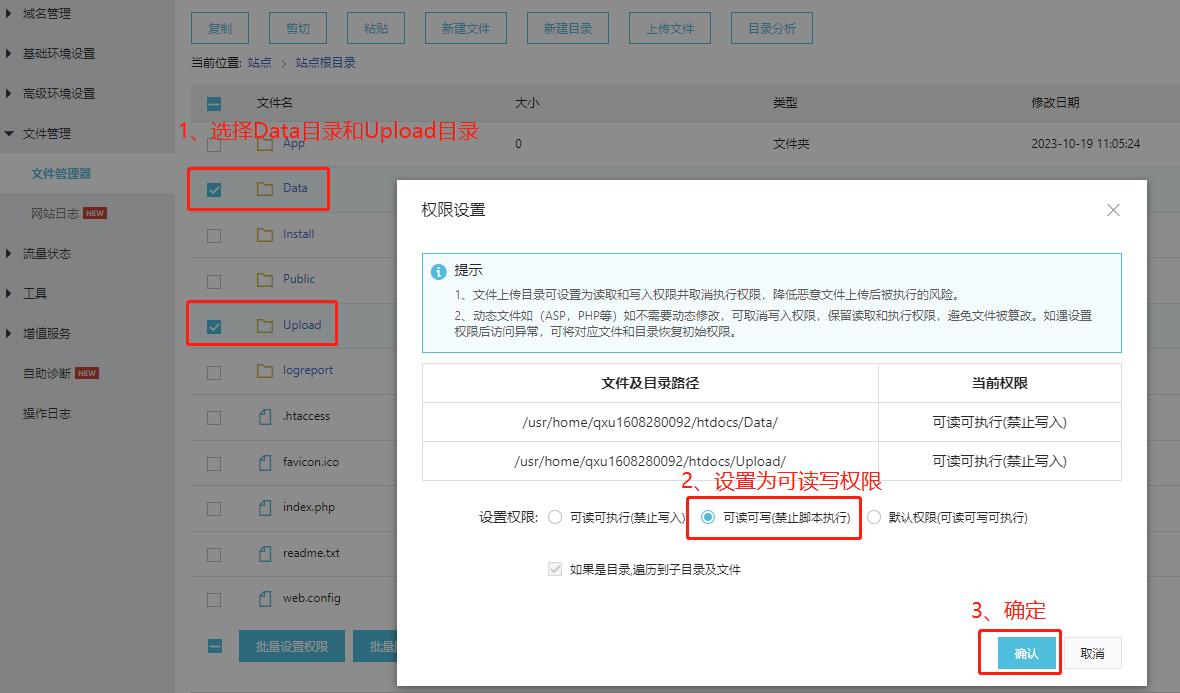第2步:設置Data目錄和Upload目錄為可讀寫權限