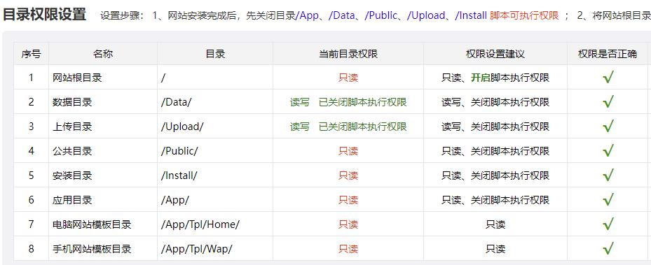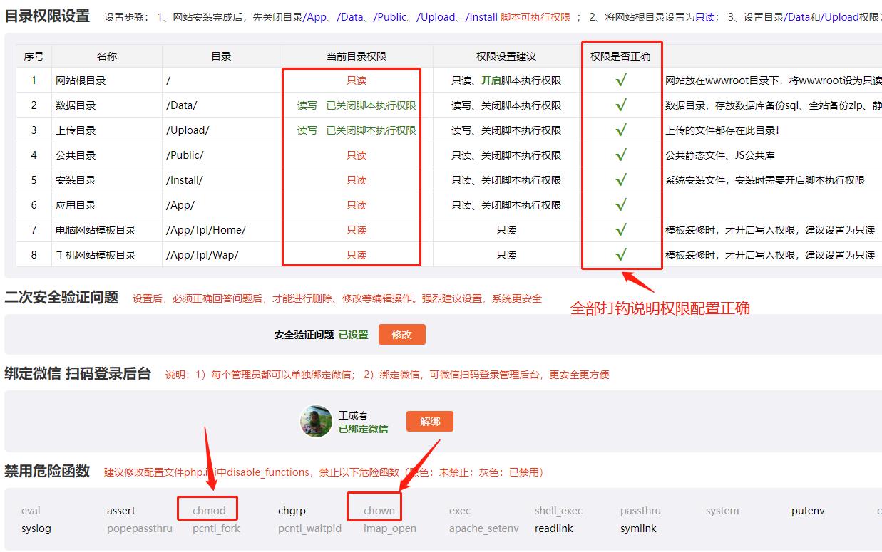 設置完成以后,登錄網站管理后臺,依次進入【設置】-【安全設置】,檢查權限是否設置成功,表格【權限是否正確】顯示設置是否成功,如下圖所示: