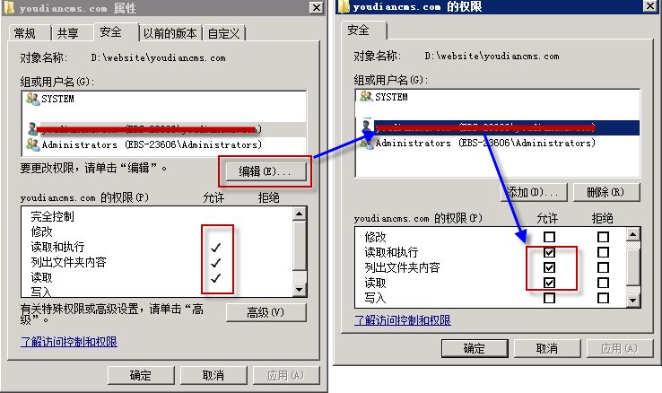 打開網(wǎng)站的目錄,右鍵單機(jī)網(wǎng)站跟目錄,選擇【屬性】,選擇網(wǎng)站對應(yīng)的訪問賬號,然后點(diǎn)擊【編輯】按鈕,根據(jù)需要來設(shè)置是否選擇寫入權(quán)限,如下圖所示: