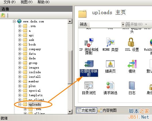 IIS7也類似于IIS6.0,選擇站點(diǎn)對應(yīng)的目錄,Upload文件目錄,雙擊功能試圖面板中的【處理程序映射】,如下圖所示