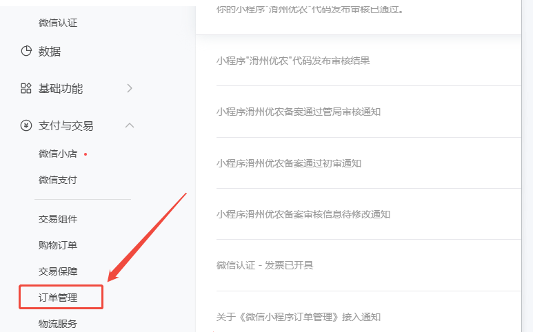 并在在小程序后臺收到了消息:《微信小程序訂單管理》接入通知。如下圖所示