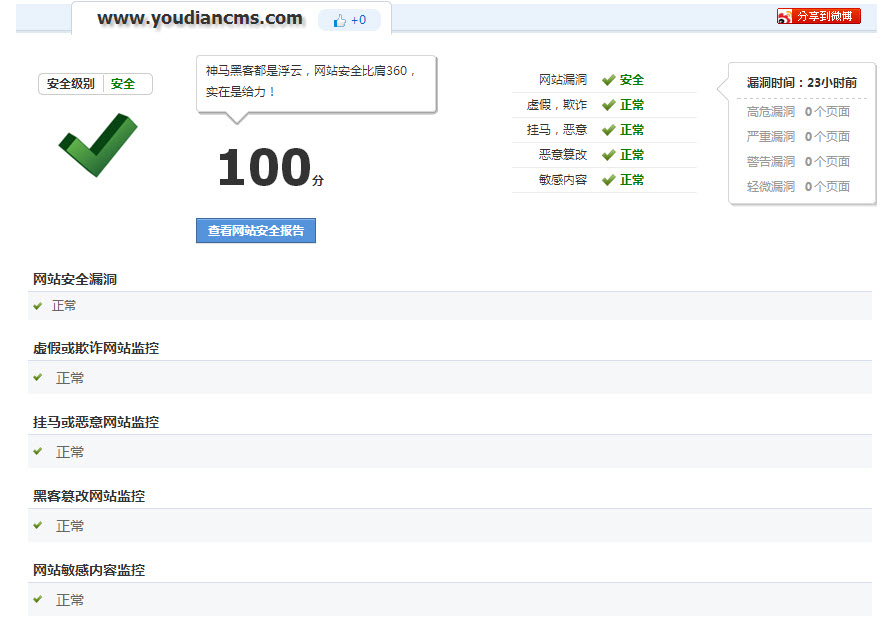 》經(jīng)過研發(fā)團隊不停地完善,成功通過360網(wǎng)站安全在線檢測,沒有發(fā)現(xiàn)任何漏洞,得滿分